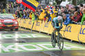 The riders head to the start, and the jersey wearers are always at the front. In this photo though you might mistake Froome on the right as wearing the white jersey, but in reality that’s just Team Sky’s new kit. Because this is the start of Stage 2, there wasn’t yet a king of the mountain (red polka dot) jersey handed out yet.