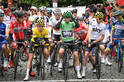At the start line on Stage 2 of the Tour. The jersey riders lead peloton over the line. They also have to sit through 15 mins of photos. pic.twitter.com/1bWO7ocEWj