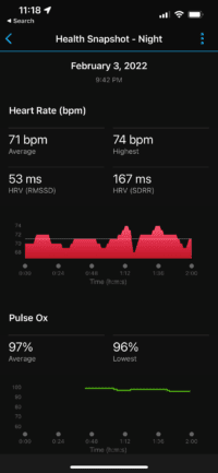 The way it works is that you sit down and do nothing for 2 minutes, during which time the Health Snapshot feature will capture your: Resting heart rate, Breathing Rate, Blood Oxygen Level, Stress, and HRV level. To start it, you just scroll down to Health Snapshot, and then sit down. I’d recommend sitting for a minute or two first, especially if you’ve been active, then starting it.