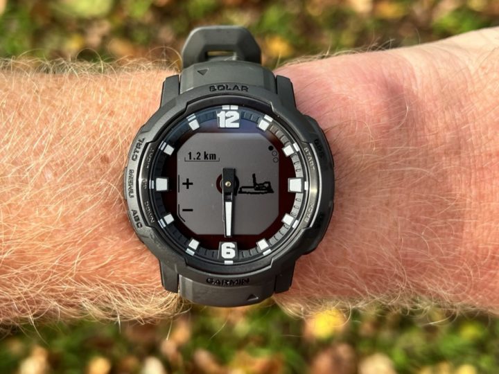 Next, we’ve got the hands. These electronically controlled hands show the time of day, but also, countless other things. They move at sub-second rates to whatever position is needed for that particular page. You can change the watch face, just as on any other Garmin Instinct series watch, but here’s a slightly tweaked variant of the default:
