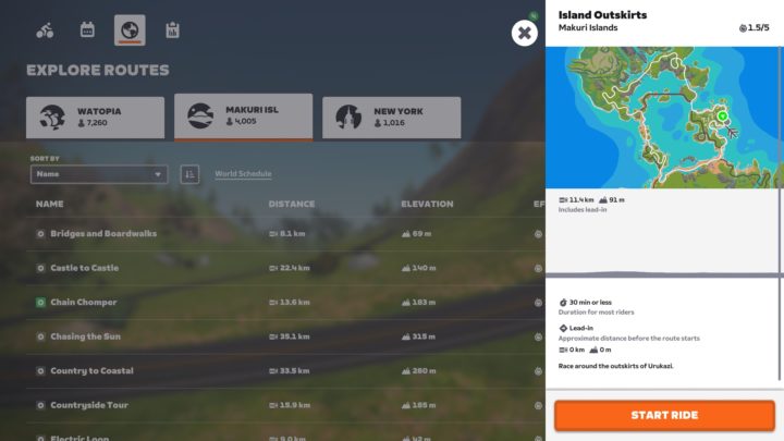 I’ve listed all the new ‘Routes’ below, but keep in mind in Zwift parlance, routes overlap, so that doesn’t equate straight to new roadways/trails. And some of those routes start from areas previously in the game, getting you to Urukazi. In my case, I did the Island Outskirts route, since that’s totally new stuff, and a nice loop. The Urukazi update adds about 22KM of ‘roads’, while in total, the larger Makuri map now has 40mi/64km of ‘roads’ in it.