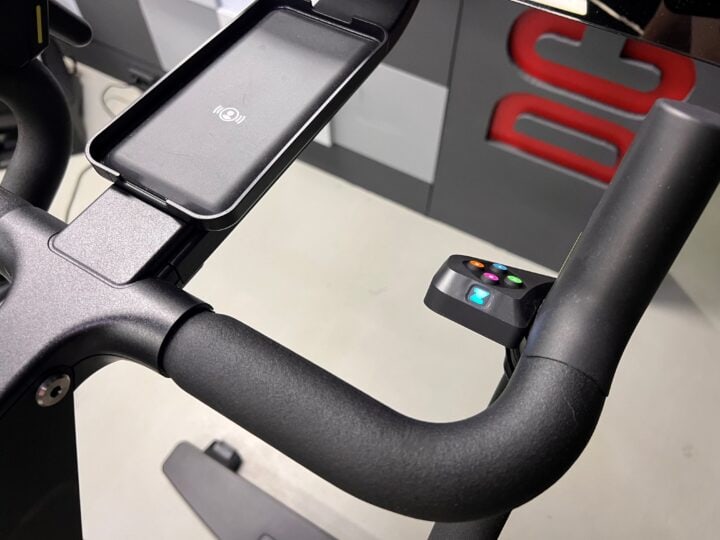 Also, it does work with some smart bikes. For example, below I tried it on the Wahoo KICKR Bike V1 & V2, the Tacx NEO Bike Plus, and the TechnoGym Ride indoor bike. The Wahoo and Tacx bikes were easy-peasy. But the TechnoGym Ride required using a screwdriver for leverage to get the strap attached, it was a super tight fit! Also note, the Tacx NEO Bike Plus is *DIFFERENT* than the original Tacx NEO Bike, which is not compatible, as the handlebars there are a wonky custom design (versus the standard handlebars on the NEO Bike Plus). Meanwhile, Zwift says the Wattbike ATOM & Stages SB20 bikes are incompatible. For the Stages SB20 bike, it’s the underside/inside SB20 sprint button that gets blocked. Though otherwise, it fits.