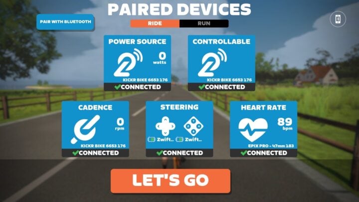 Interestingly, on a Wahoo KICKR Bike, which has steering and braking in Zwift already – you can concurrently pair that up, and it actually works. You can use either Zwift Play or KICKR Bike to both steer and brake, at any time (just tried it). In fact, in the main UI portion it’ll even show as a total of 7 devices paired (HR, Cadence, Controllable, Power, Play Left, Play Right, and KICKR Bike). Kinda cool!