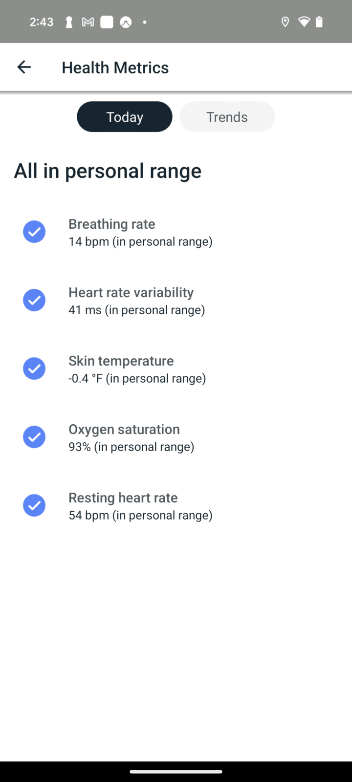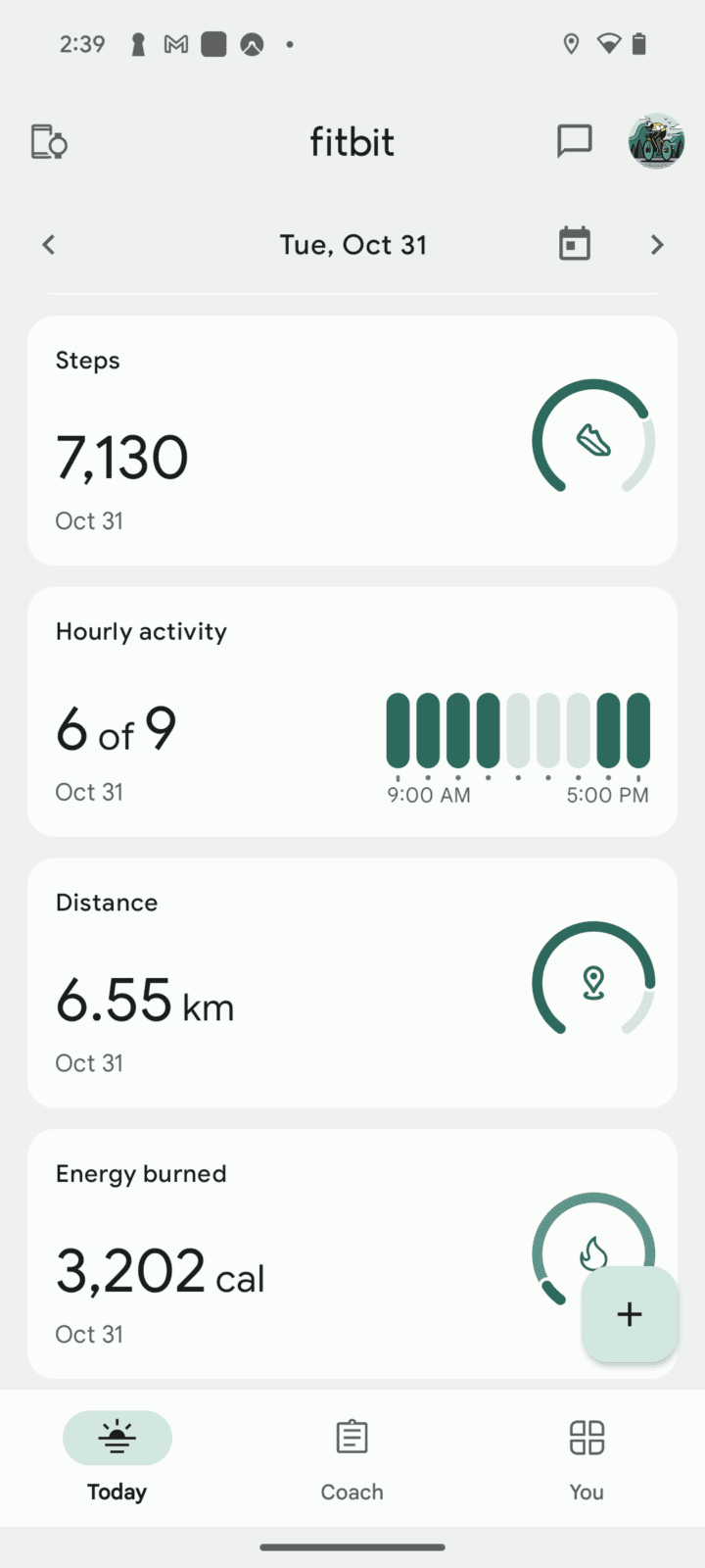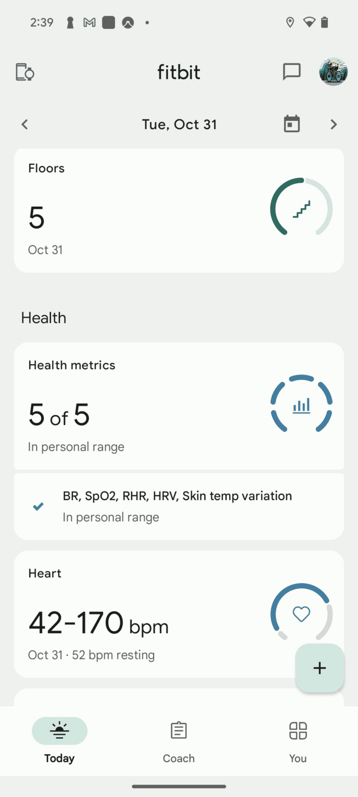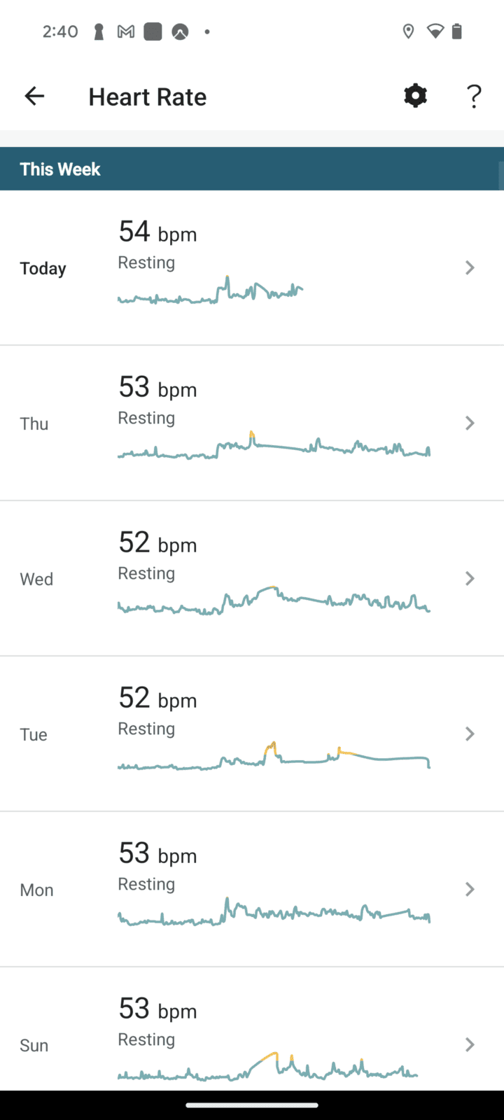 In total, this section covers the following data: Steps, Floors, Distance, Calories Burned, Active Zone Minutes, Exercise Days this Week, Hourly Activity, Heart Rate, Resting Heart Rate, Sleep, Blood Oxygen, Skin Temperature Variation, Body Responses, and Mindfulness. As with last year, you can’t adjust this list, despite that little settings icon. That simply signs you out of the Fitbit account.
