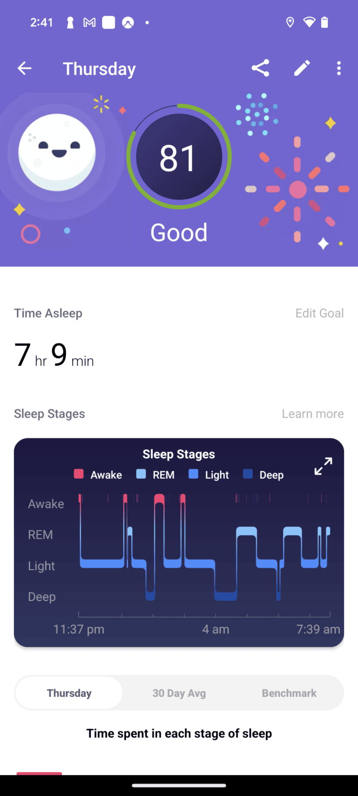 As you open this up, you’ll see the sleep details for last night, including sleep stages and your sleep times this week. Note that I’ve found the sleep times (time I went to sleep/woke-up), pretty solid. No issues there, it’s matched within a few minutes. As for sleep stages, that’s not something I focus on from an accuracy standpoint, as the methodologies that you can use to compare sleep stages simply aren’t all that accurate, in the 80% range. Thus, comparing to a non-accurate metric seems a bit odd to me. So instead, I just focus on the times I woke up and fell asleep.