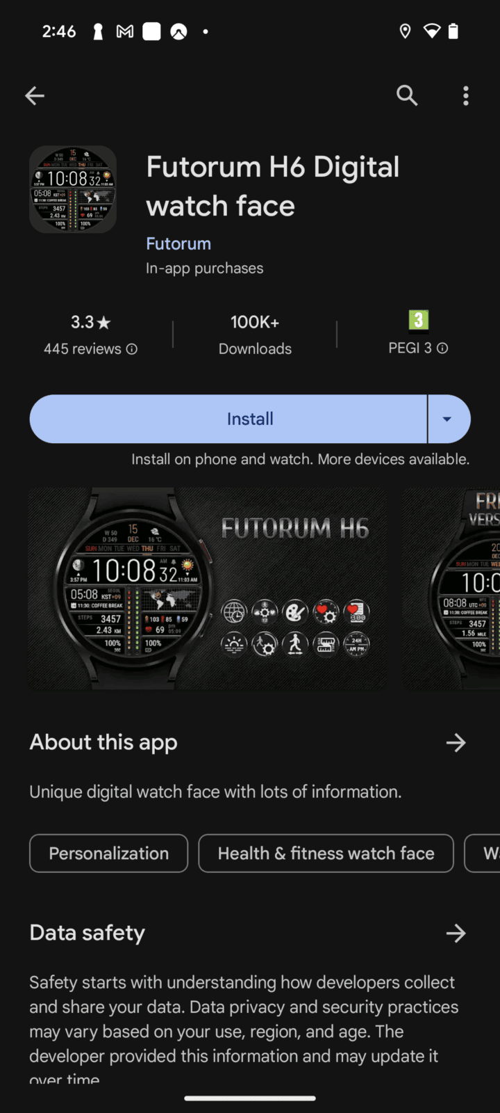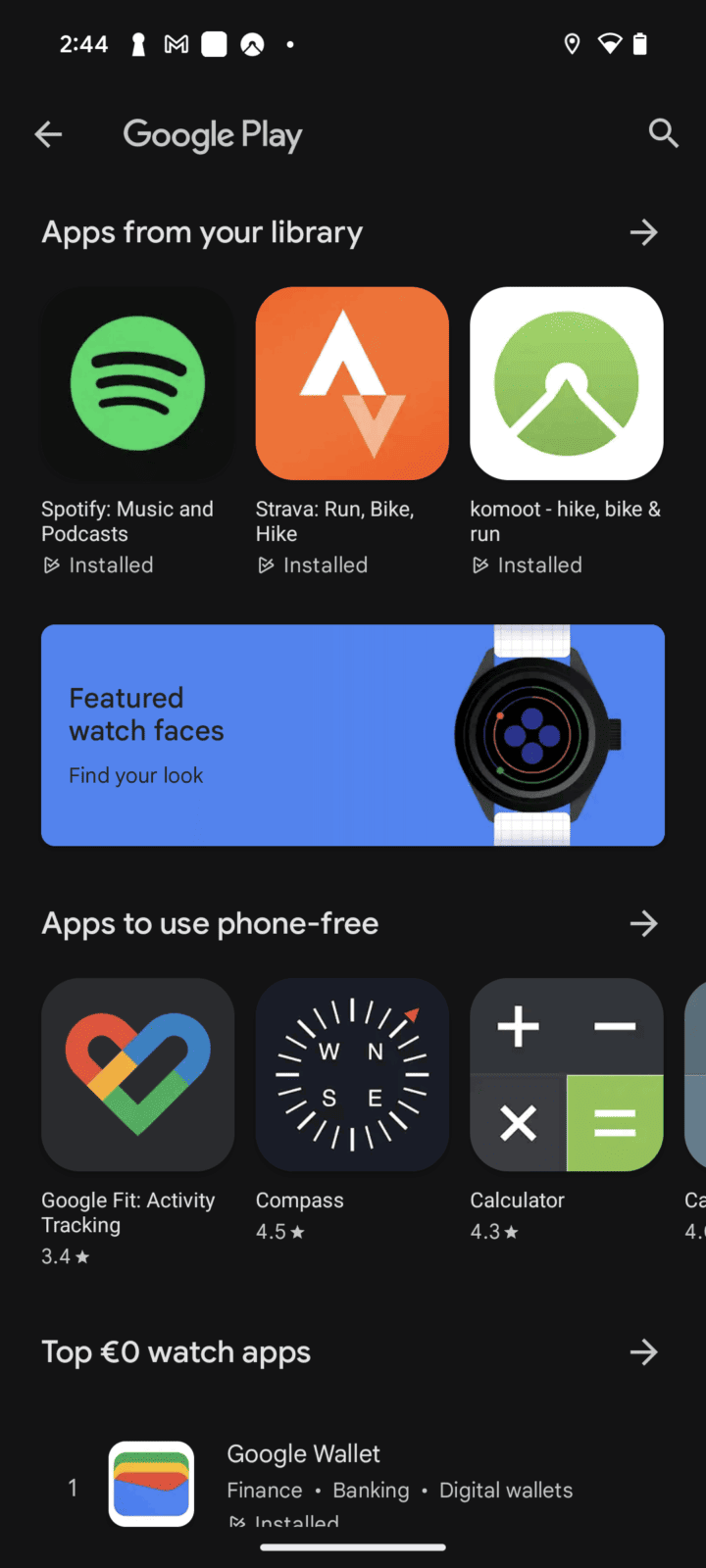 Now, turning our attention elsewhere briefly, one of the strengths of the Google Pixel being on WearOS is the ability to install 3rd party apps on the watch, including watch faces. In my case, this has included Strava, Spotify, and Komoot. You can grab these using the Google Play store on your phone:
