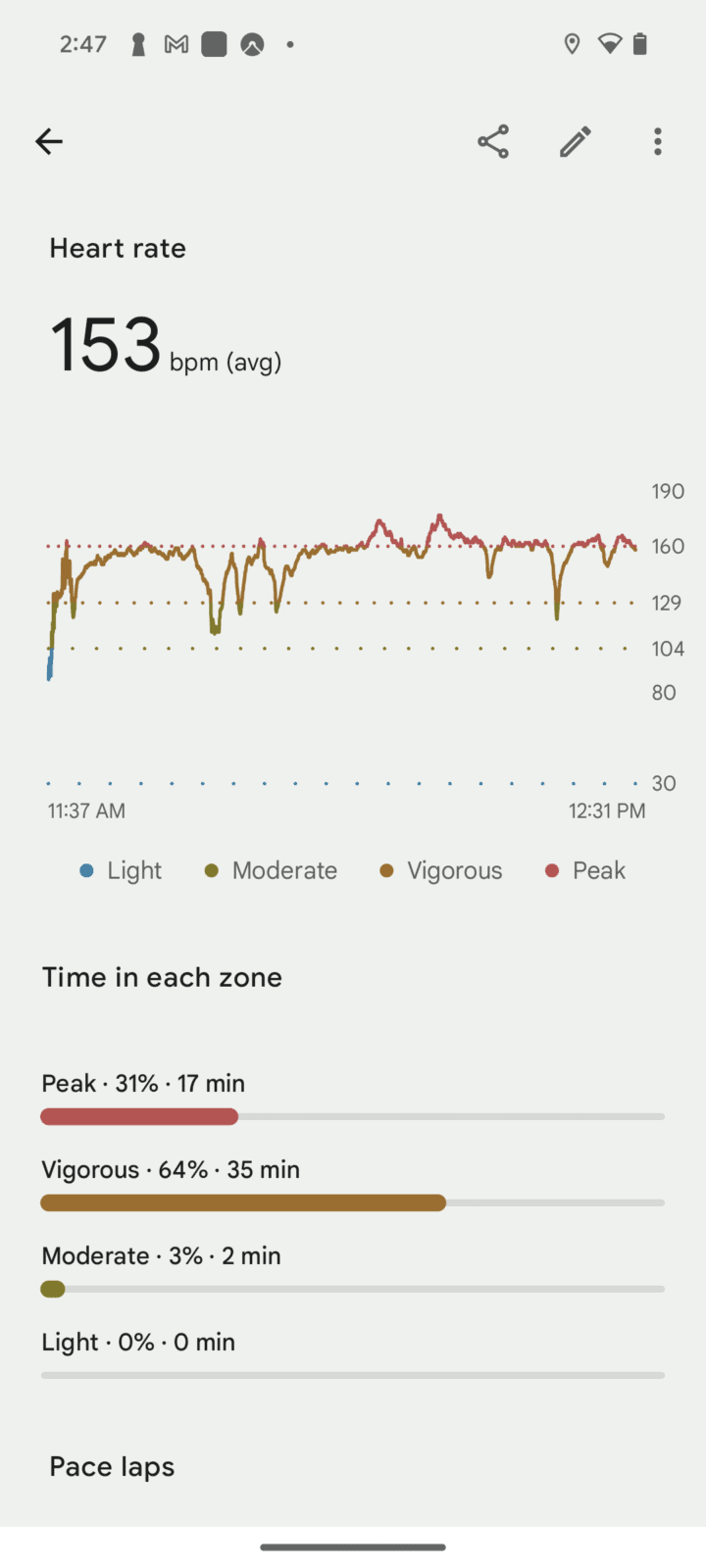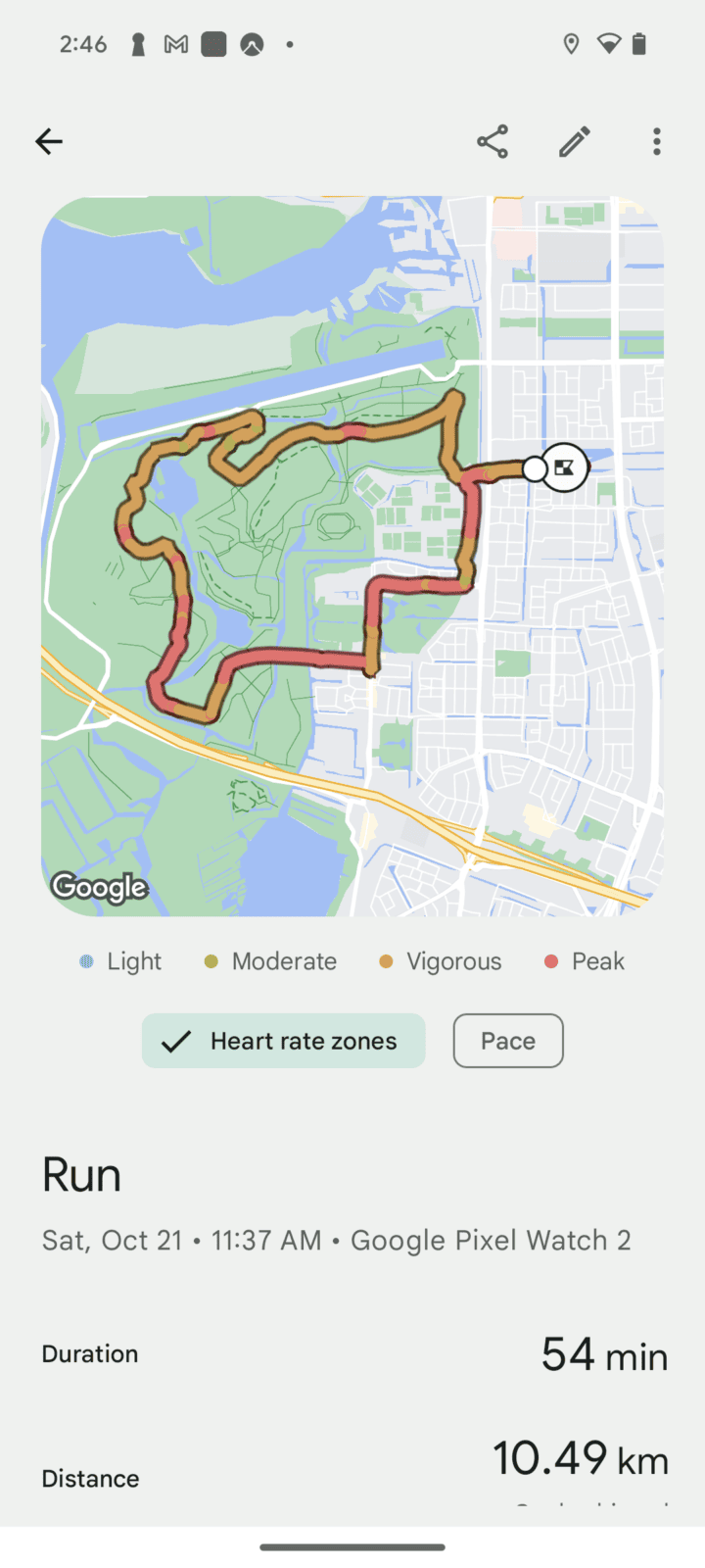 I’d argue this continues to be a pretty big weak point of the Pixel Watch for sporty folks. Virtually every other platform/watch out there allows far more customization, and certainly more than one data page. While the Pixel Watch will show an added data page once in your workout for the zone pieces, this is still pretty slim pickings.