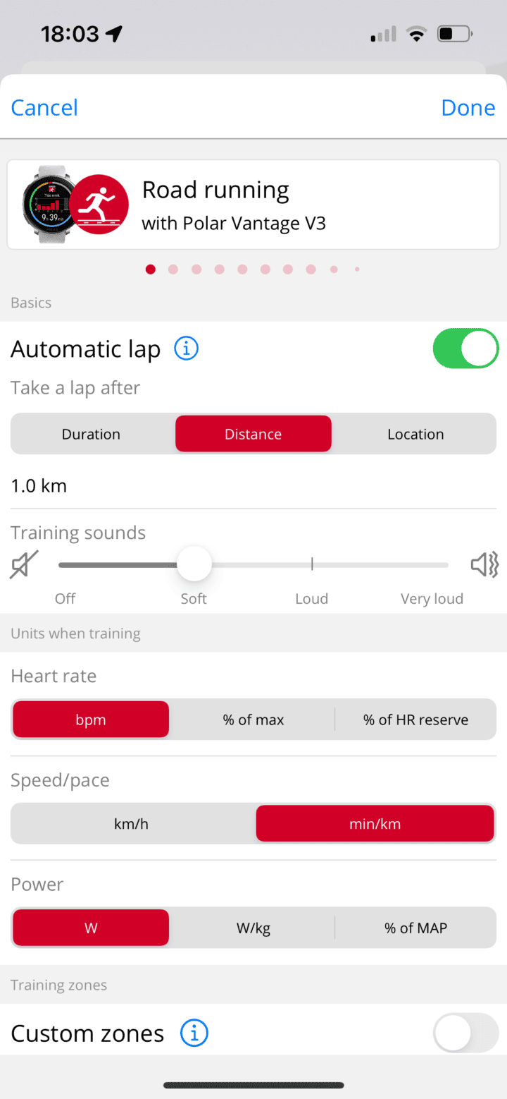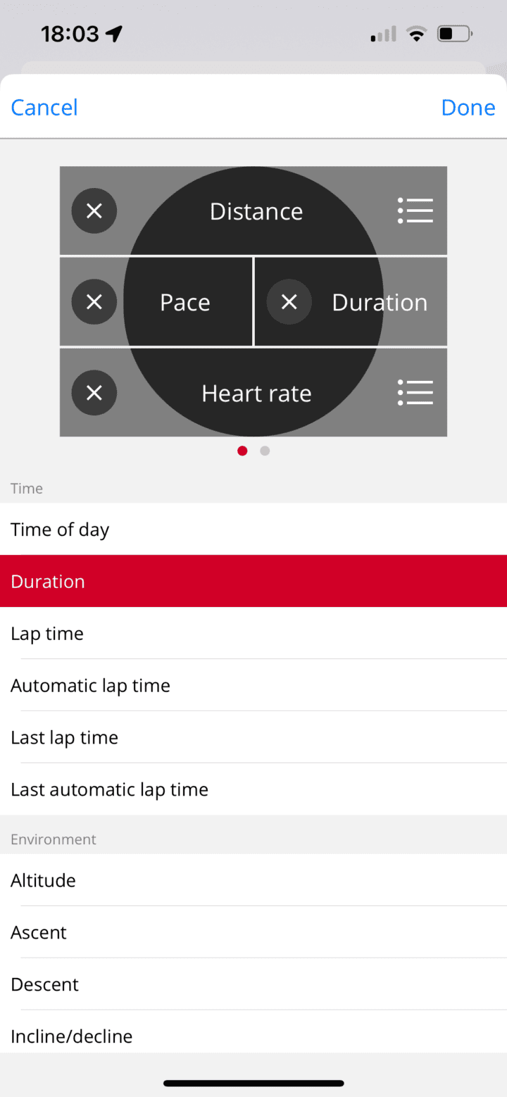 Next, setting aside sensors, we’ve got the data pages you can configure. This can be done via the Polar Flow app on your phone, or Polar Flow on the website. You can configure up to 8 data pages per sport profile, and up to four fields per data page. You’ll find pretty much any data field you need here: