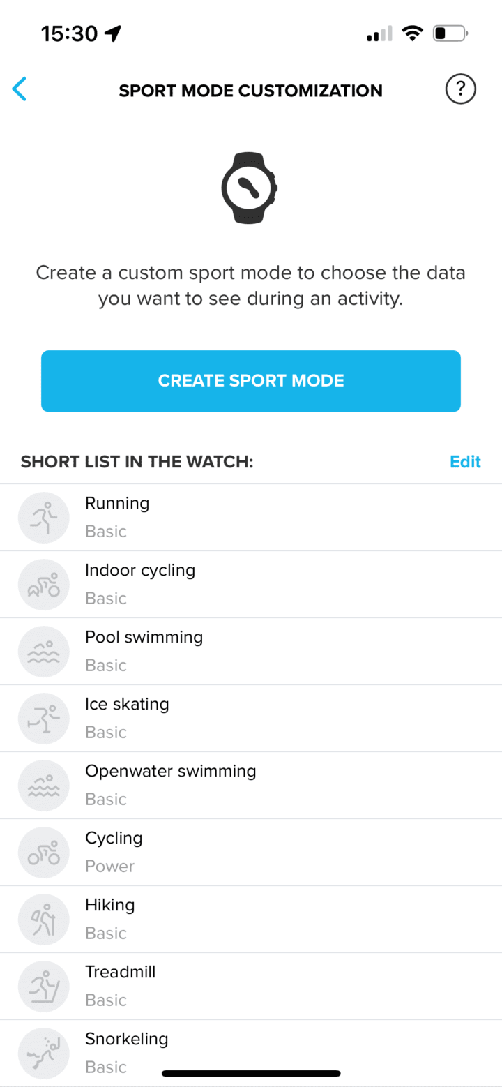 Once you tap a sport mode, you’ll be brought to this page here, which shows GPS status, sensor connectivity status, battery life estimates, and more.