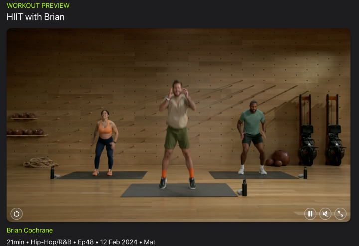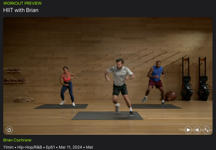 Likewise, for cycling, this class I did yesterday had five trainers in it, effectively forming their own gruppetto. You’ll also notice that none of the gear here is high-tech. These are basically generic indoor bikes. Apple Fitness+ won’t show or control any resistance/power levels within a class, but, if your Apple Watch has a cycling power meter or smart trainer connected to it, it’ll save that data for analysis post-workout. Thus, at the end of my workout yesterday, I got all my cycling power and cadence data within the Apple Fitness app for this particular workout.