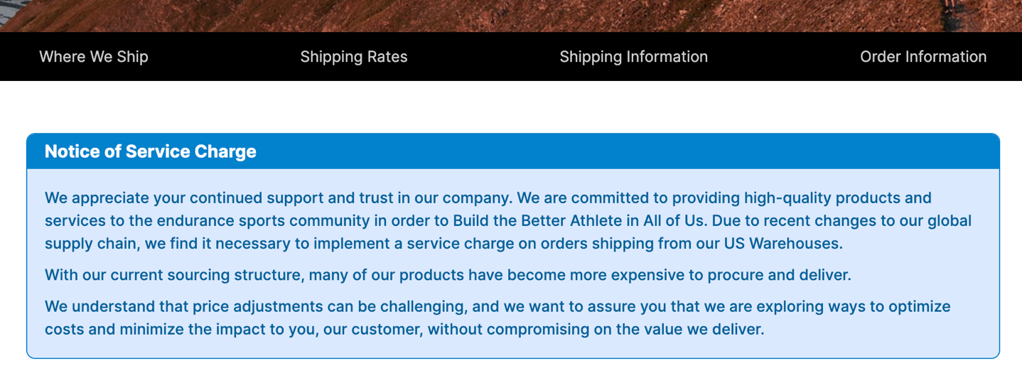 It’s the very last line of the above note that’s most critical. This is because the week prior, Wahoo actually did list the tariff surchage specifically as a ‘tariff surcharge’. However, that was described as no longer compliant with aforementioned search engines and platforms, thus, requiring the change to either include the tariff within the base price, or, to add it as a variable charge (e.g. shipping).
