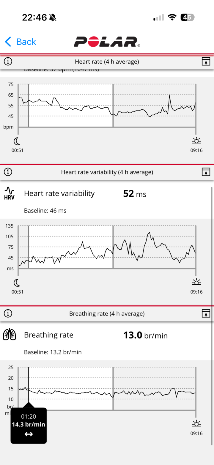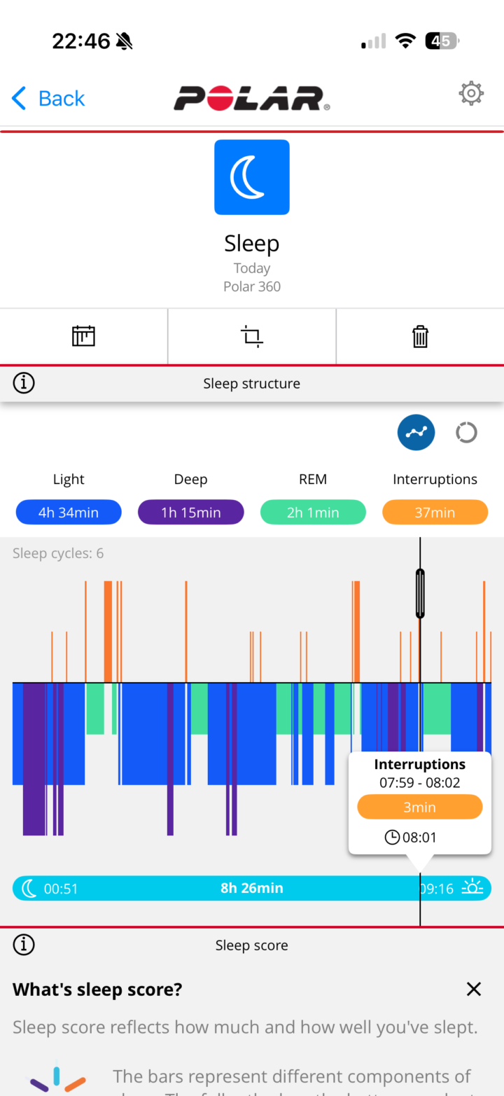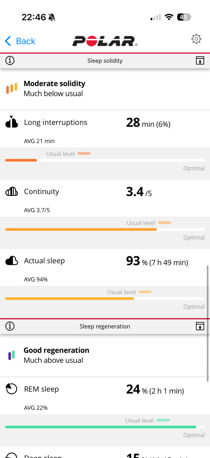 In any case, waking up, you’ll see your sleep metrics within the Polar Flow app. The app is identical to the existing Polar Flow app. You can see my sleep times, sleep phases, HRV metrics, etc…