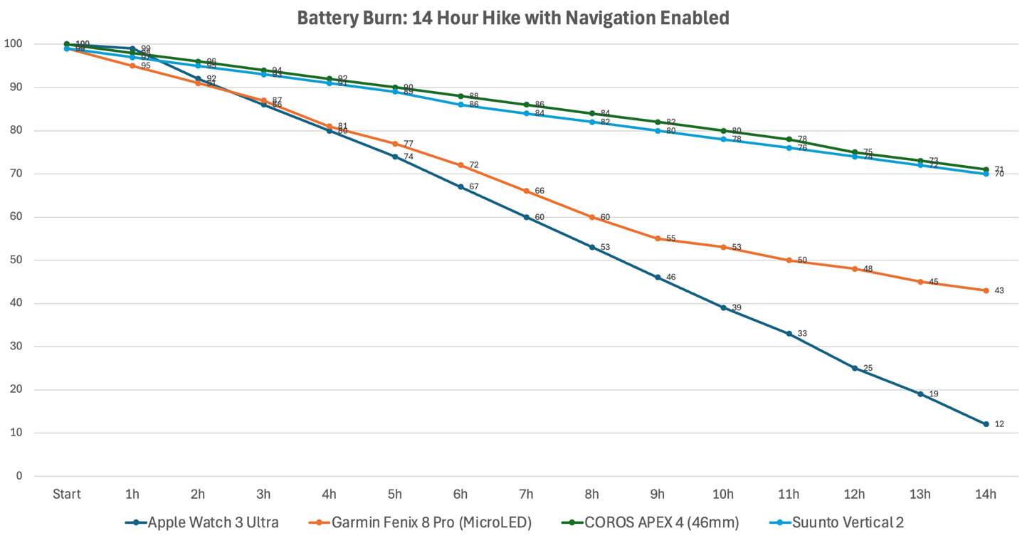 Finally, looking at battery burn, here’s how things looked on that 14hr hike with navigation enabled. In this case, I was mostly on non-map data pages for all units, save for turns, where I’d look at the map on all units at once. You can see here the COROS APEX 4 (MIP) & Suunto Vertical 2 (AMOLED) were near identical at about 2% an hour the entire time. All watches were configured for dual-frequency/multi-band GPS.