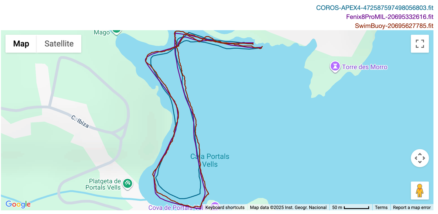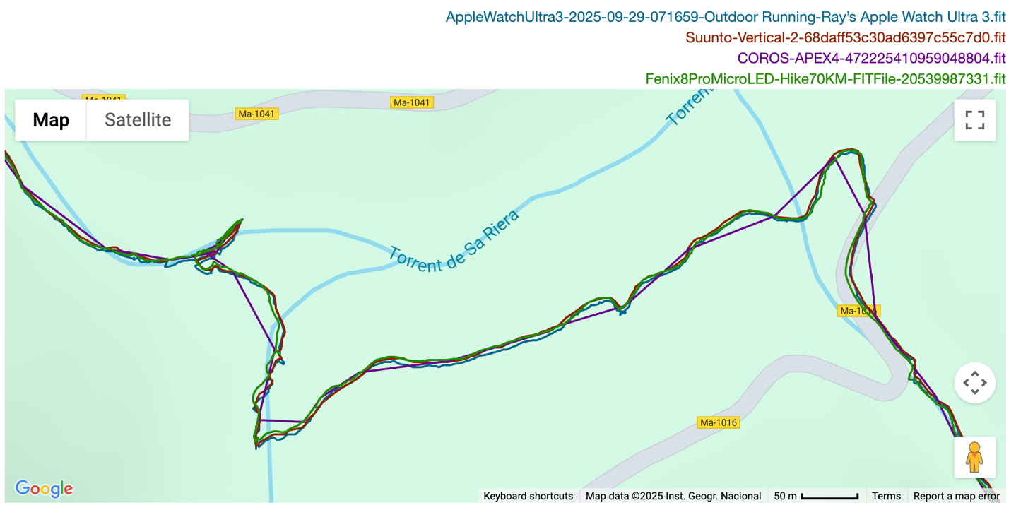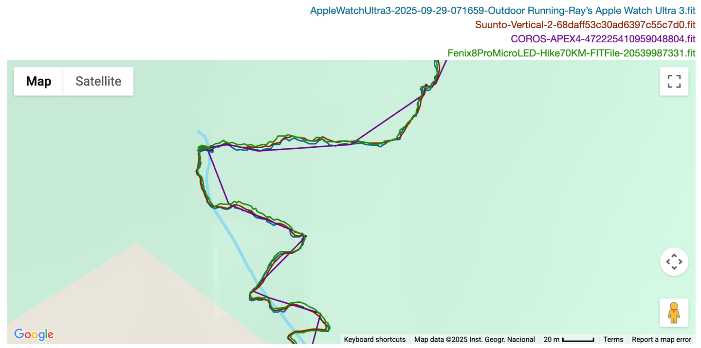 Here, another section (in this section, the Fenix 8 Pro track is briefly missing, as it took a 2KM vacation to send a satellite message, a bug supposedly fixed in a firmware update about 10 days ago). But, as you can see with the COROS, it’s like a bad smart recording from days of past.