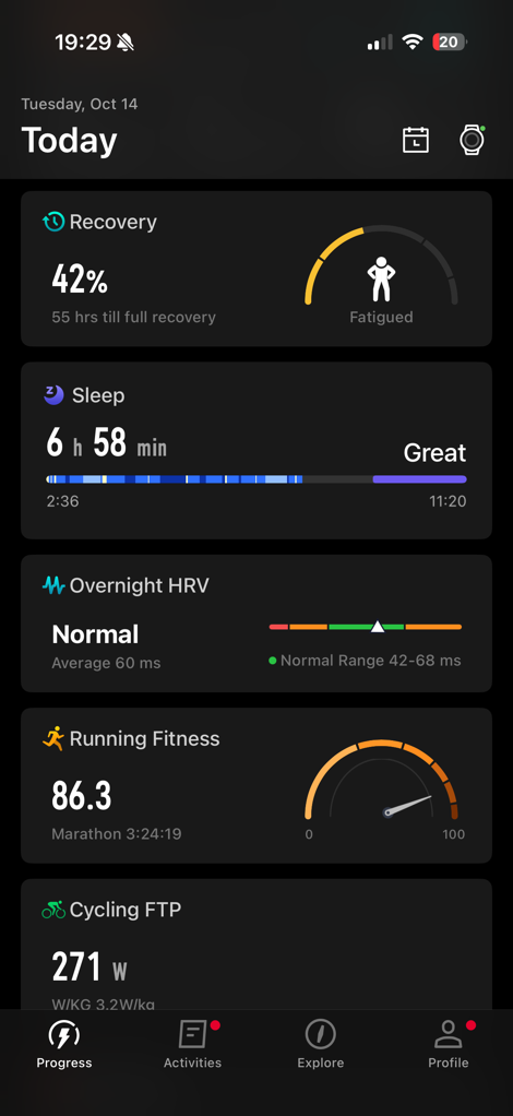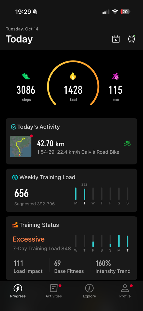 They also have training load, though, annoyingly this still resets every Monday. Other companies do proper 7-day trailing load. And COROS recognizes this, and even has 7-day trailing load in their app, but that’s not really where I want to look. So you can see here, that 656 training load value is merely my Monday/Tuesday combined load (when I took this photo), versus the last 7-days load.