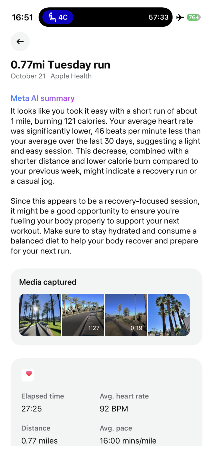Now, when it comes to the real-time metrics, you can at any time simply ask Meta for stats. You’d literally just say “Hey Meta, what’s my heart rate?”. Or, “Hey Meta, how many miles/kilometers have I gone?” Which it always answered for me quite well. Again, perhaps this could be more compelling down the road, but most of us who have Garmin devices are pretty capable of glancing at them already. But I’m sure there’s plenty of interesting use cases here, such as accessibility.