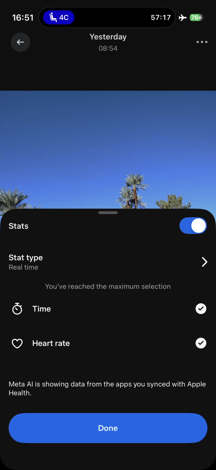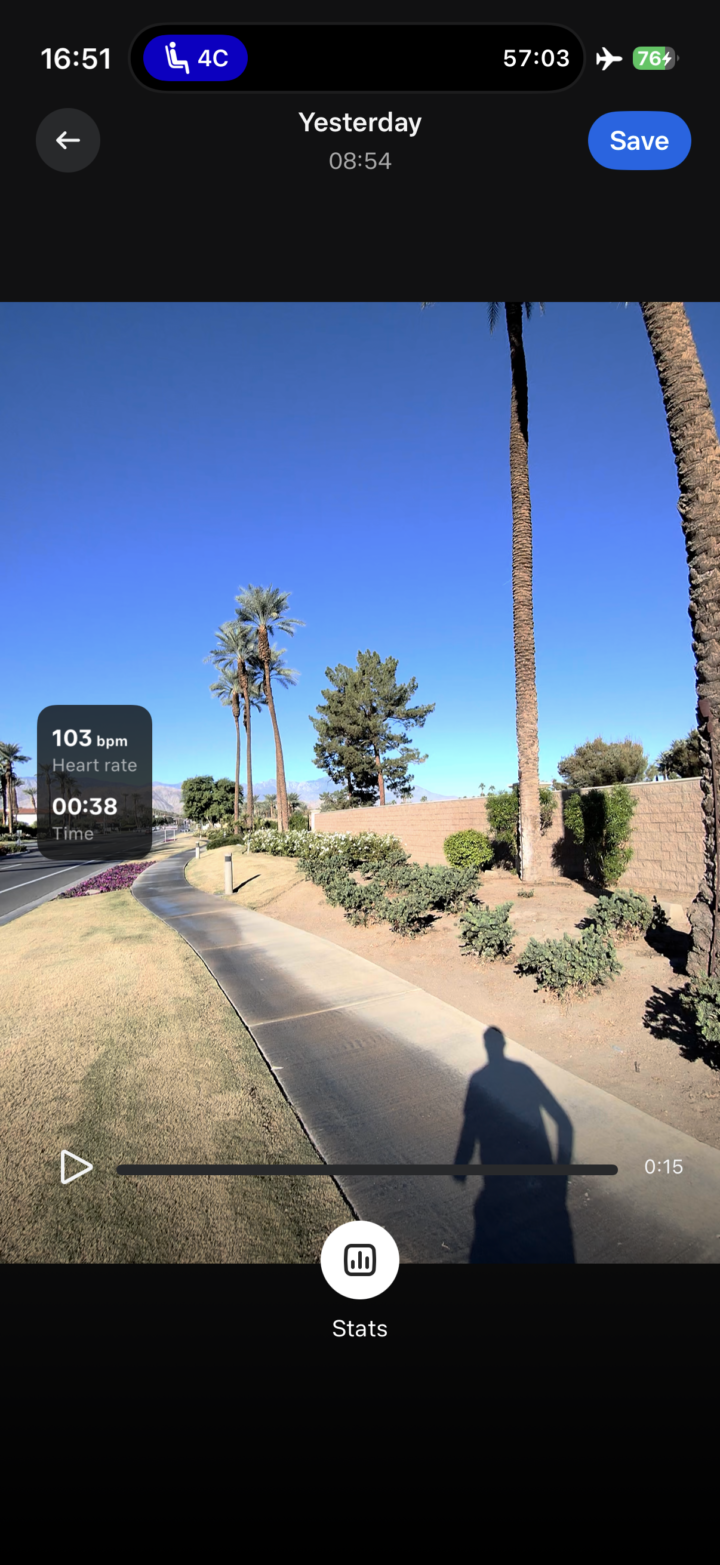 Sure, it doesn’t quite have all the crazy stats the good ol’ VIRB Edit app used to have (like Garmin Cycling Dynamics or such), but this is a good start. I’d encourage Meta/Garmin to lean into this more. Have an expando option at the bottom of the list that says “Advanced” or “Geek Mode”, and then just dump a boatload of stats in there. Like, everything and anything. Become the de facto way people show all the crazy Garmin workout stats that it collects. As they say, if you’ve got it, flaunt it. Seriously, flaunt it.