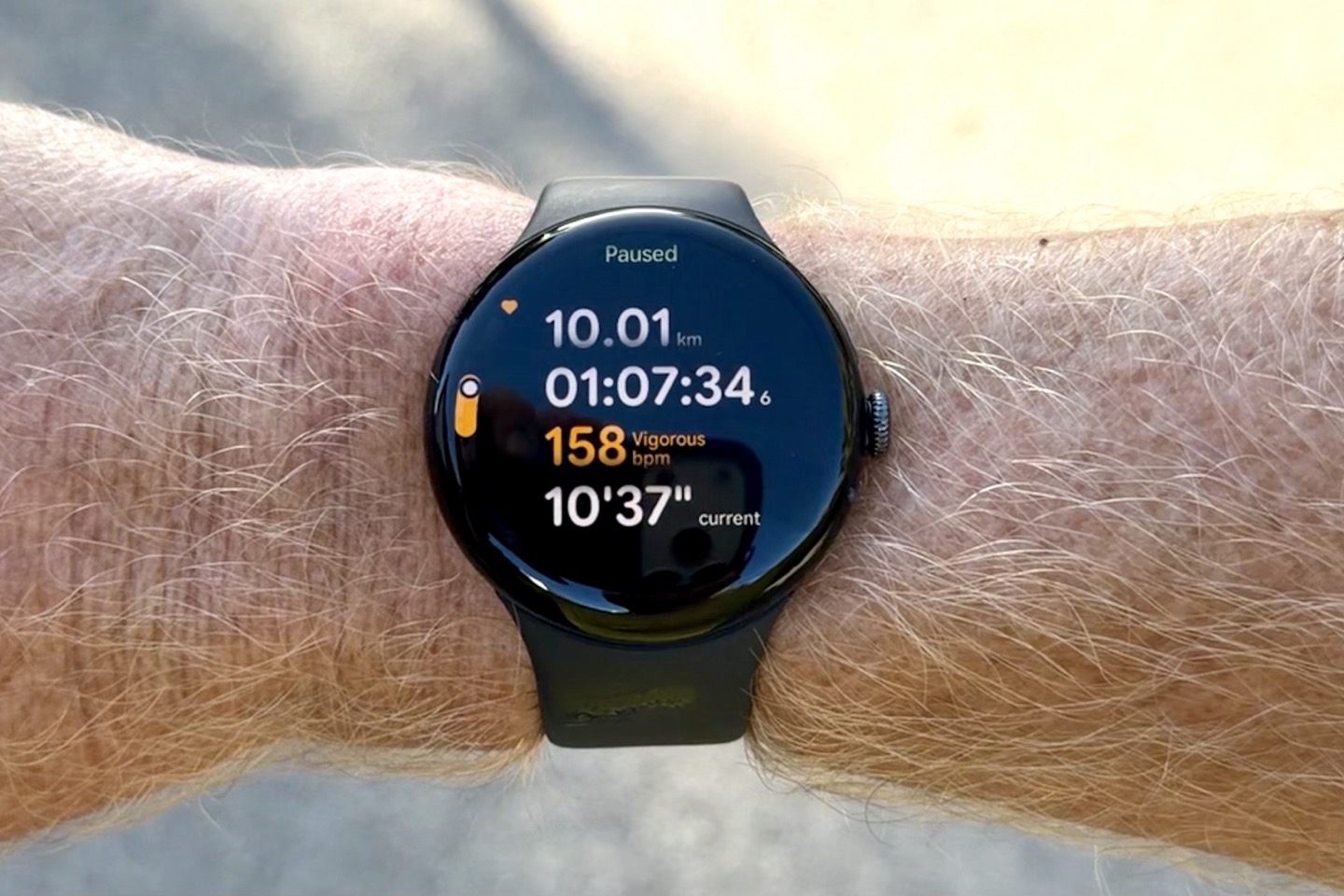 To start, the Pixel Watch 4 looks just like the Pixel Watch 3 from a distance. Only a few things give it away once you get closer. First, the bezels are a little bit smaller than previous, but additionally, the screen itself is now curved. Previously, it was just the glass atop the screen. This gives the text a bit more of a ‘bubble’ like appearance at certain angles. Likewise, you’ll get up to 3,000 nits of brightness out of it, a 50% increase. Realistically, though, the previous edition was plenty bright, and I had no issues with either Pixel Watch 3 or Pixel Watch 4 during bright sunny workouts where I live: