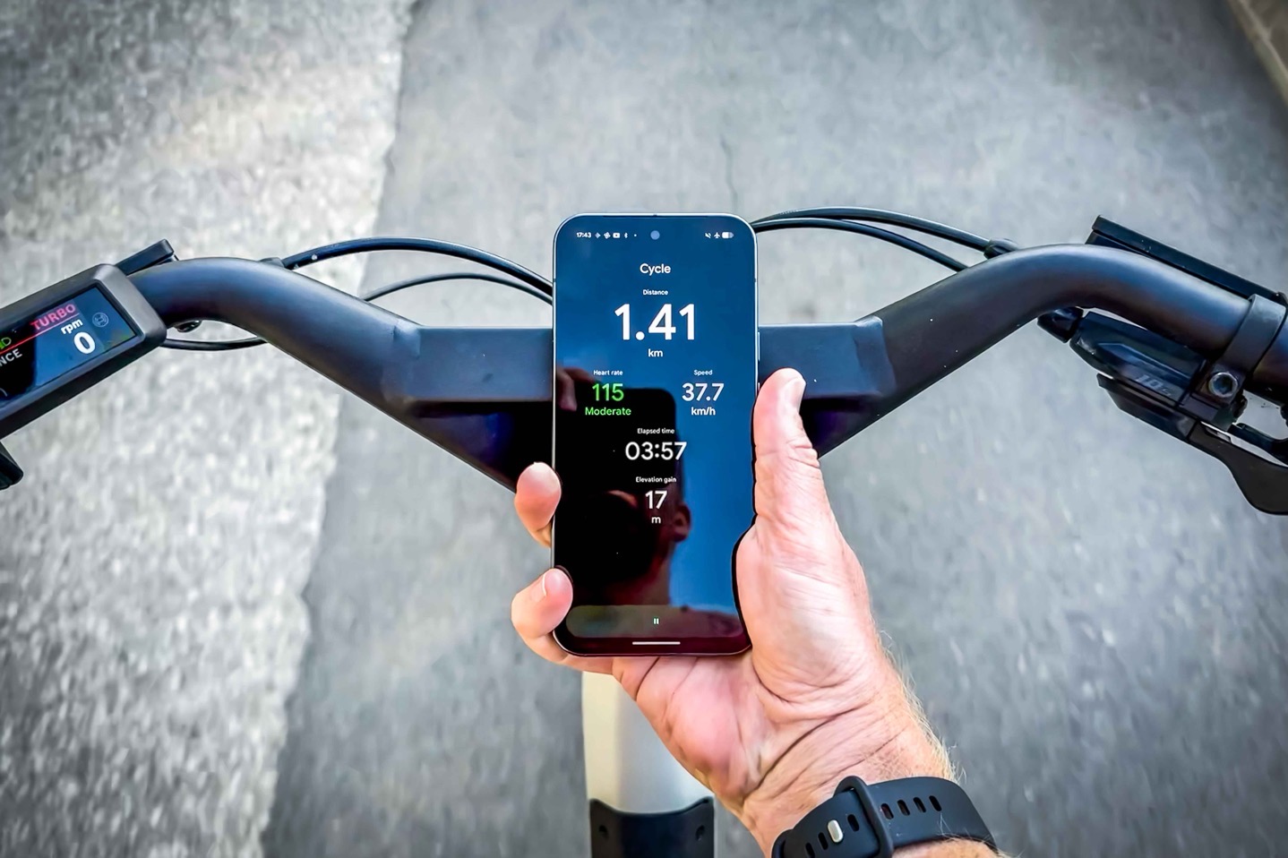 When it comes to the bike real-time streaming of data, this is pulling the data from your watch to the phone, via Bluetooth. It’s essentially loading up a page within the Fitbit app that mirrors the main data page of your watch. The goal here would primarily be bike commuting scenarios, though certainly any cyclist with a phone mount could use it. In my case, I don’t have a case/mount for this specific Pixel phone the watch was paired to, so a Yolo’d it and held it there so I could show you how it works (with the other hand holding my camera). Don’t worry, totally safe while descending.