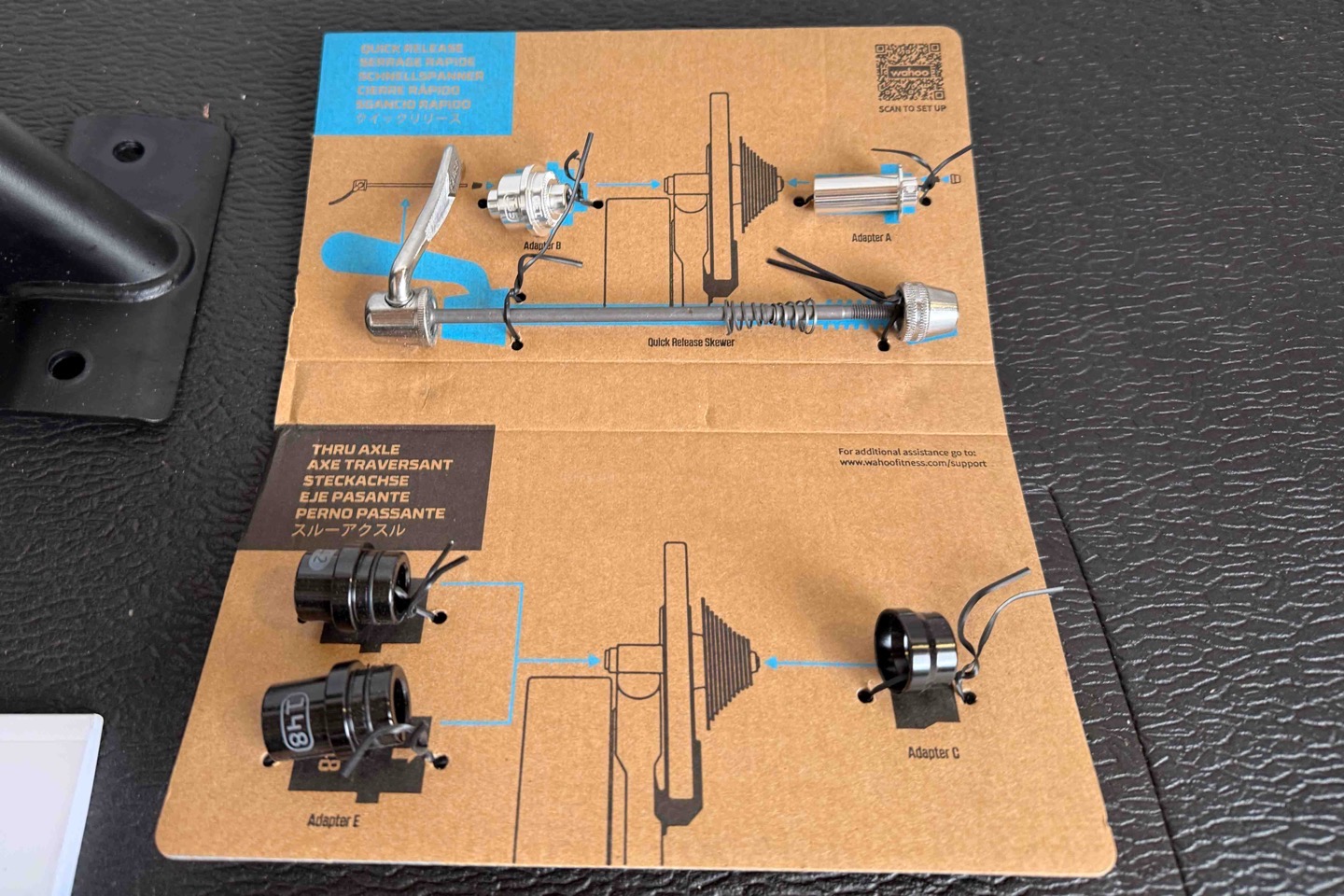 In any case, the other thing of note here is this cardboard piece. This has two sets of axle adapters in it. One for a thru-axle, and one for a quick-release skewer. It explains how to figure out which one you have, in case you’re unsure. In short, a quick-release skewer will be very skinny like you see there, whereas a thru-axle will be roughly the thickness of your finger.