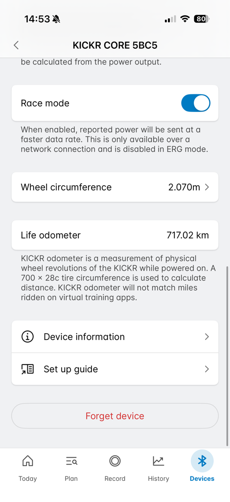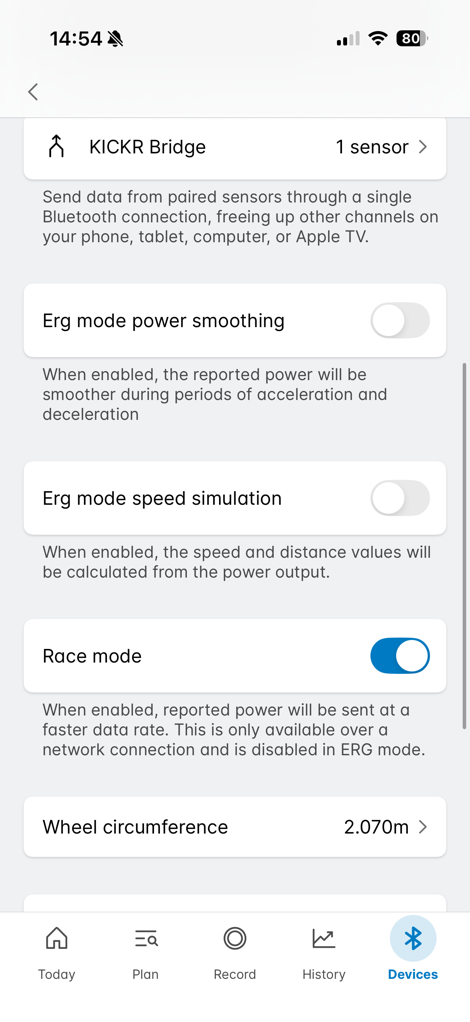 Further, the KICKR CORE 2 supports so-called ‘Race Mode’, which means that it transmits your power data at a much higher rate than once/second. In Race Mode, it transmits at 10hz (10 times a second), when connected via WiFi or Bluetooth (Zwift only for Bluetooth). You can toggle this in the settings of the Wahoo app first, and you’ll simply notice it updates the number in Zwift far faster/continuously while riding.
