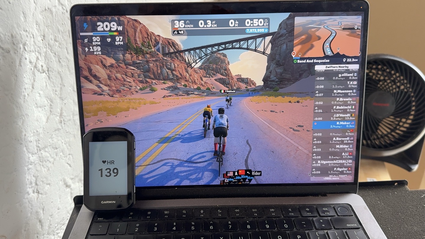 However, back in Zwift, it was hanging yet again. You can see this below with the bike GPS showing the current HR (139bpm), and Zwift showing a stuck value (97bpm):