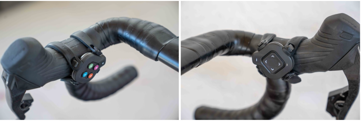 Instead, the virtual shifting piece happens entirely from the handlebars with the Zwift CLICK’s, which control shifting between Zwift and the trainer. Thus, if you have the Zwift COG, now is a good time to install those Click’s. There are a few different places you can stick them, which is entirely user preference. Generally speaking the ‘best’ place is on the inside or outside of your handlebars, like so: