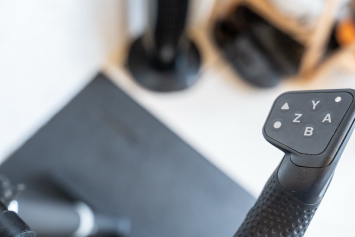 Let’s quickly run through the post-build hardware aspect, most notably (and starting with), the handlebars. There is where you’ve got a set of buttons on top for interacting with various apps, including steering: