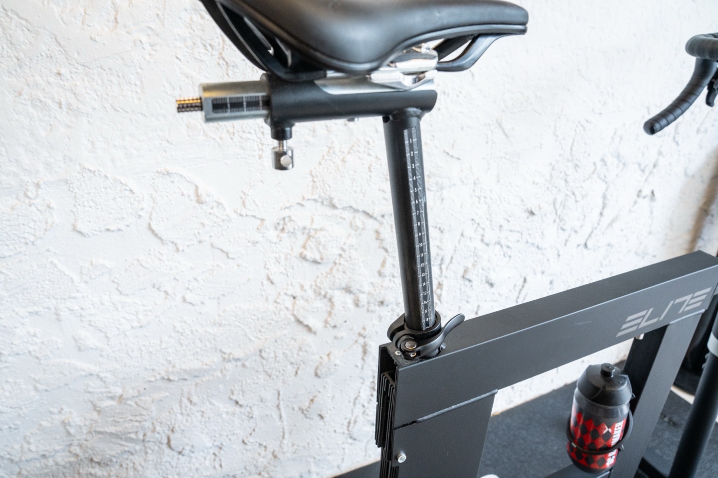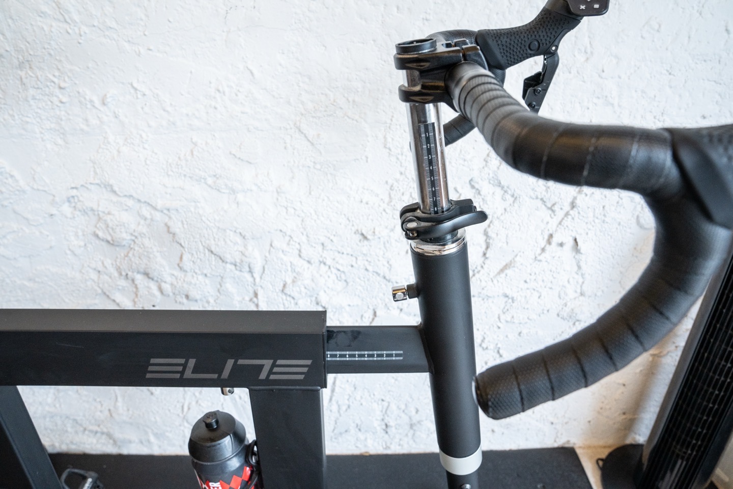Next up is the front-end adjustment. To begin, you can increase the height up/down of the handlebars, followed by one to adjust forward/back of said fork (located just underneath the ‘I’ in Elite on the frame).