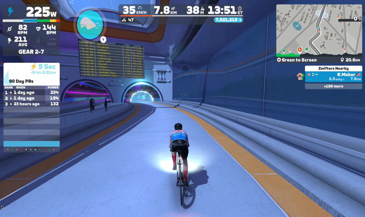 For reference, here’s what a typical gear indication screen looks like on Zwift (see upper left corner, Gear 2-7). But unfortunately, this isn’t shown with the Elite Square. The example screen below is with the Zwift Cog.