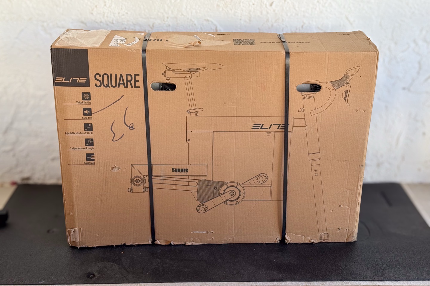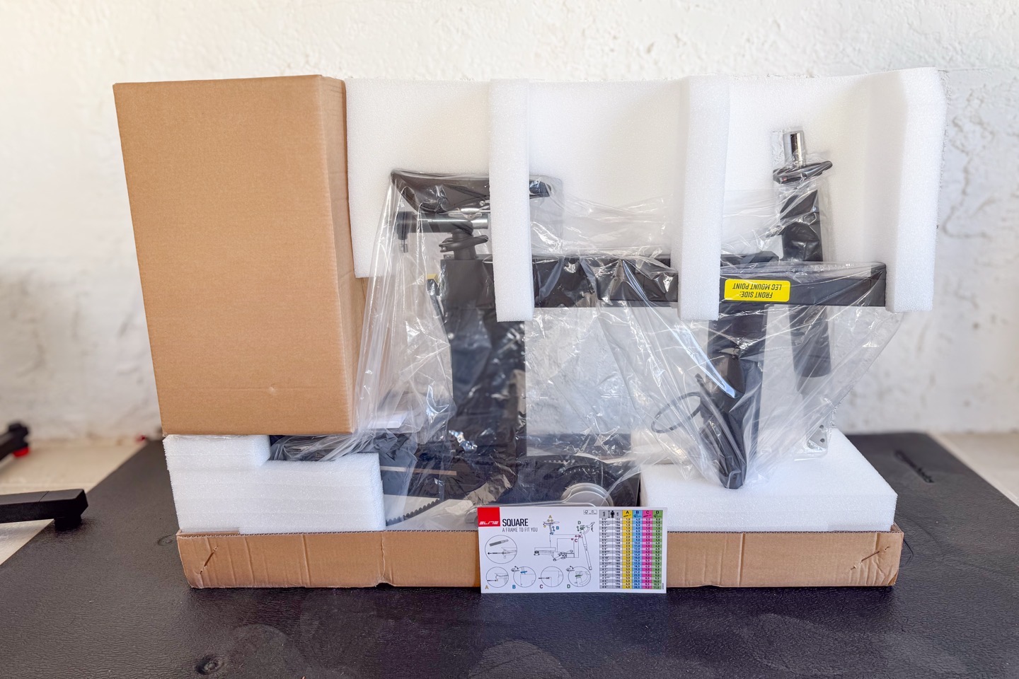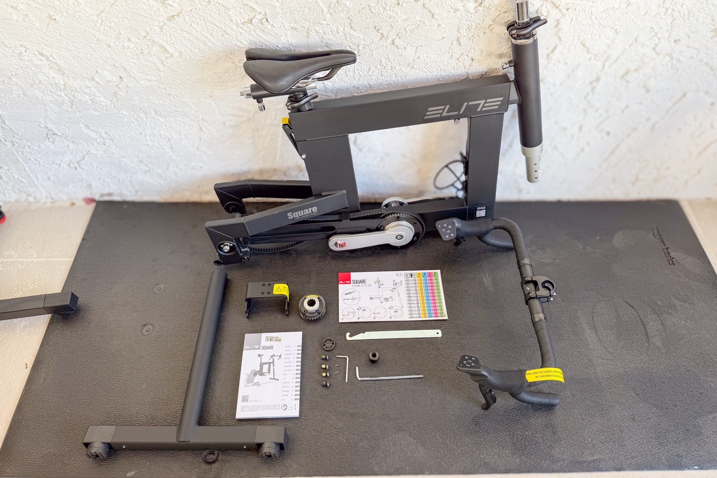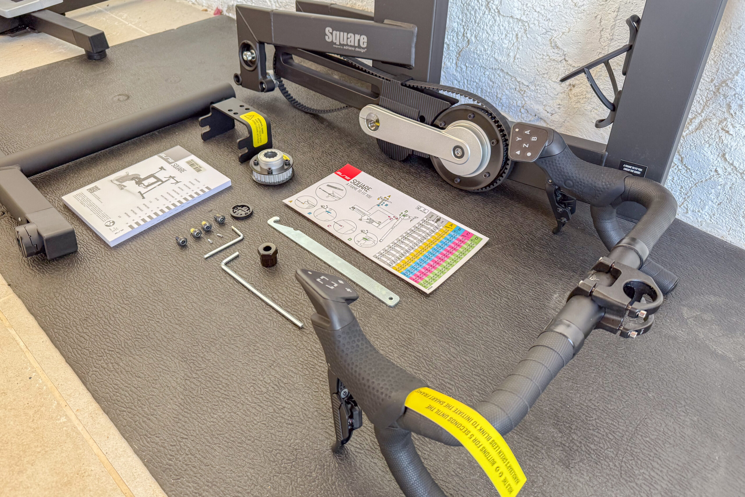 The Elite Square comes in one big box, which in turn contains multiple boxes inside of it. The core of the Elite Square frame is pre-assembled, but there’s a bunch of accessory bits that need to be attached, as well as of course the trainer itself.