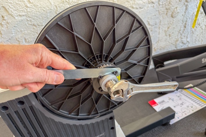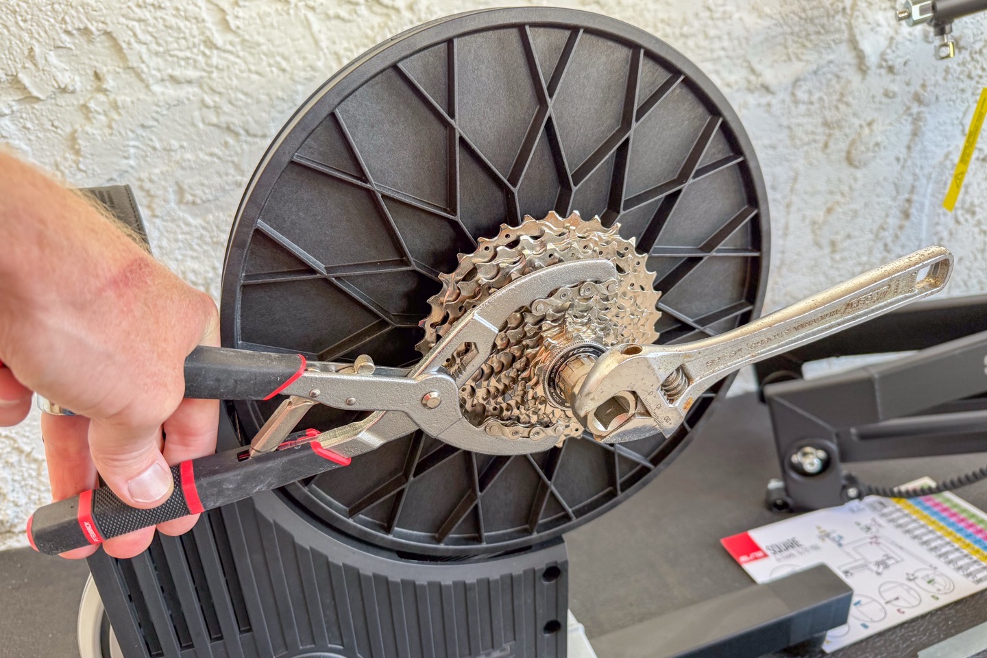 Next, you need to swap out the cassette on your trainer, for the Elite Square belt drive system. First, remove your old cassette using a cassette tool: