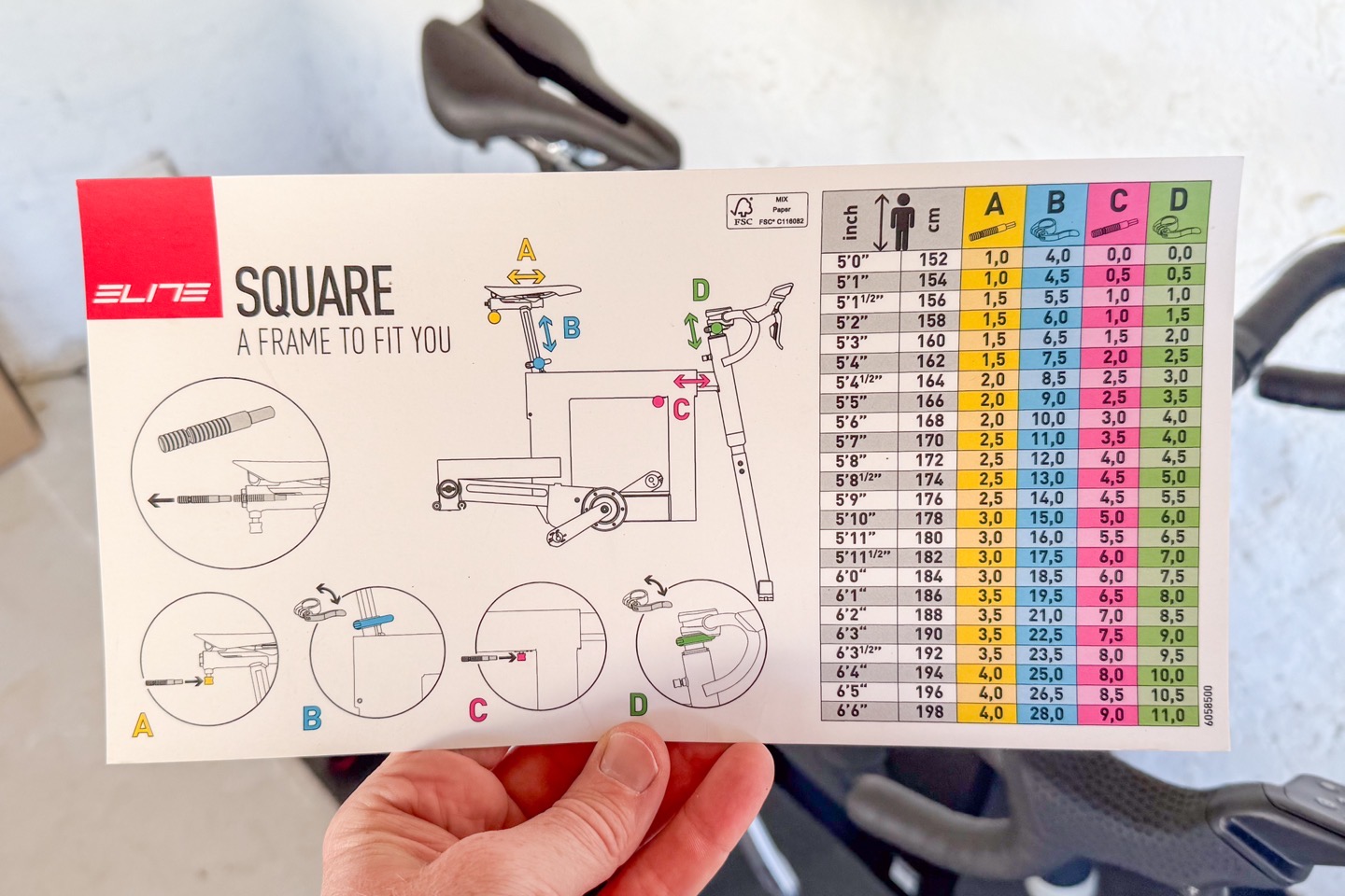 Next, on the frame side, there’s multiple adjustment points. And, quite handily, Elite includes this nifty card that shows you a starting point for your height, and where each adjustment should be made. Obviously, everyone is going to be slightly different in terms of their body (e.g. longer legs vs torso), but this is at least a rough guide for where to begin.