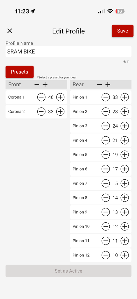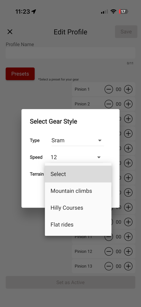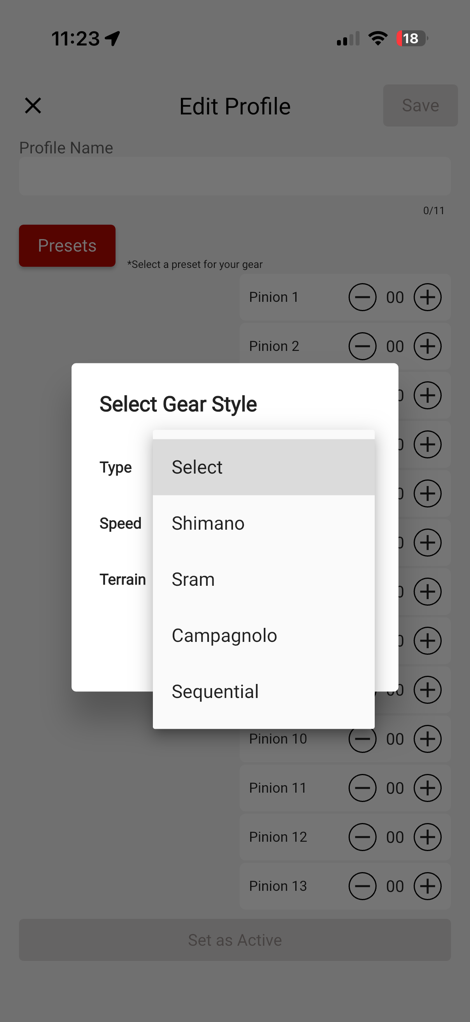On the virtual shifting profile side, you can create a pile of different virtual shifting profiles, each based on a core shifting pattern first (Sequential, SRAM, Shimano, Campagnolo), and then from there, the number of gears you want, followed by a quick-gear setup (e.g. flat, hilly, mountain), followed finally by the ability to customize every single cog if you want: