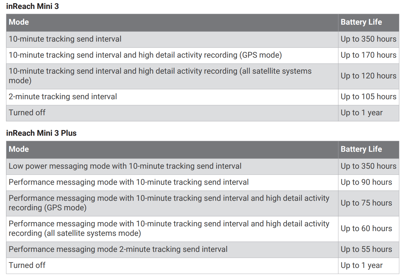 Before we get into the testing, let’s start off with the official battery charge for the inReach Mini 3 series, which you’ll find below, from the manual: