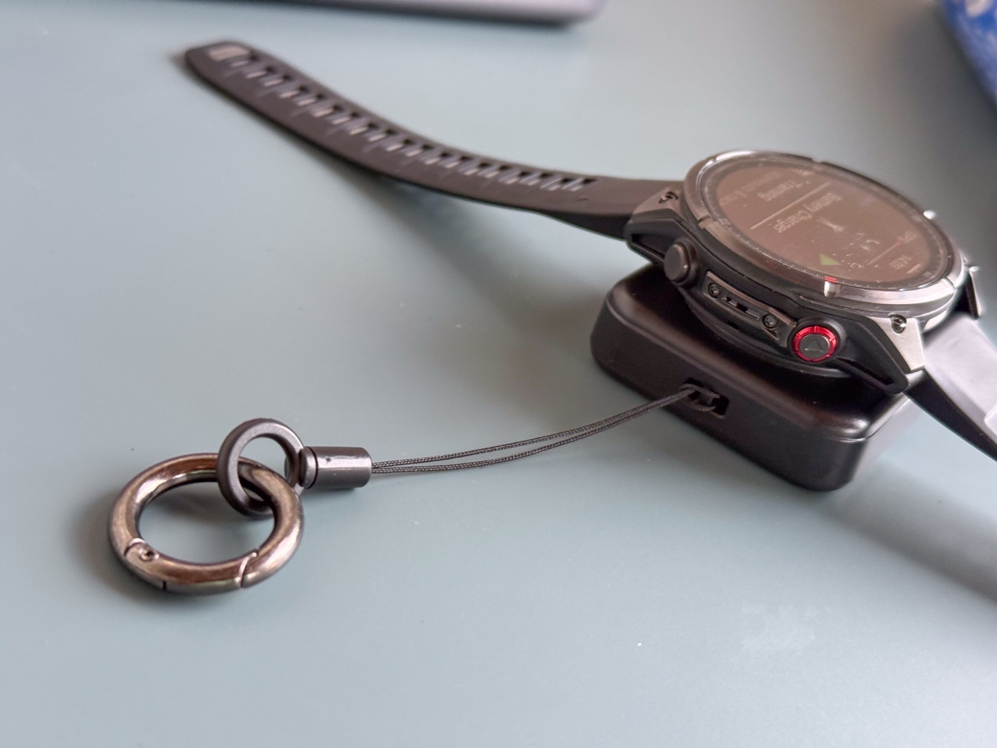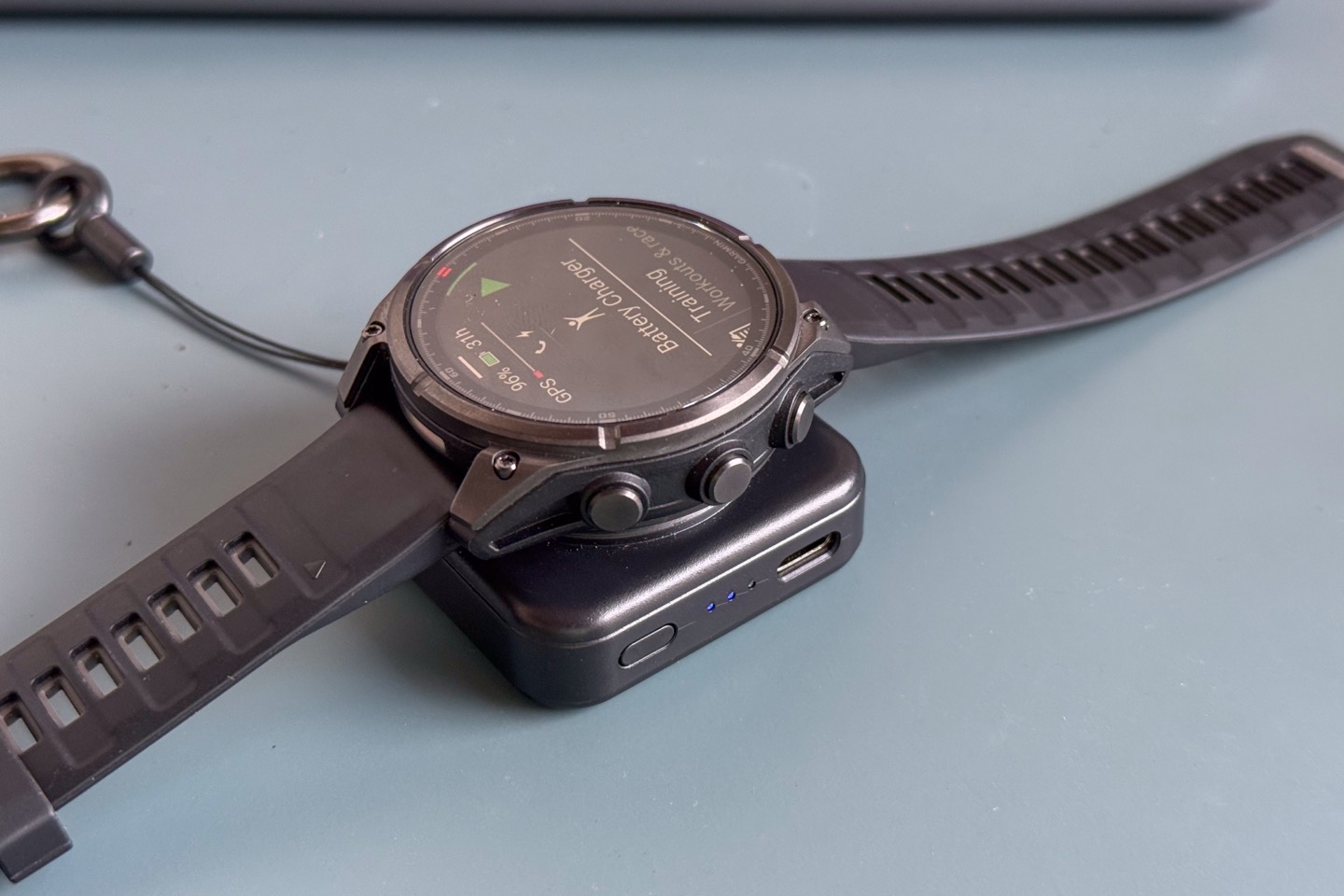However, it won’t hold on there permanently if jostled. It’s not MagSafe or such. You can wrap the watch around the unit, like your wrist, and that works for watches with slightly smaller straps (like the Garmin Bounce 2), but for longer straps, I find even on the tightest option, there’s still a bit of play there, which would get bonked if in a backpack or such.