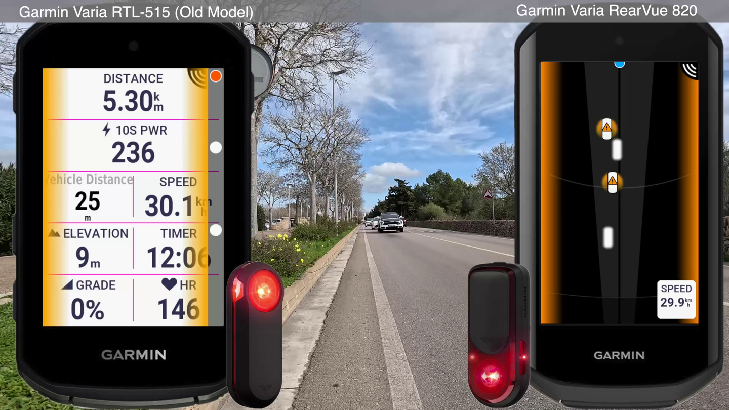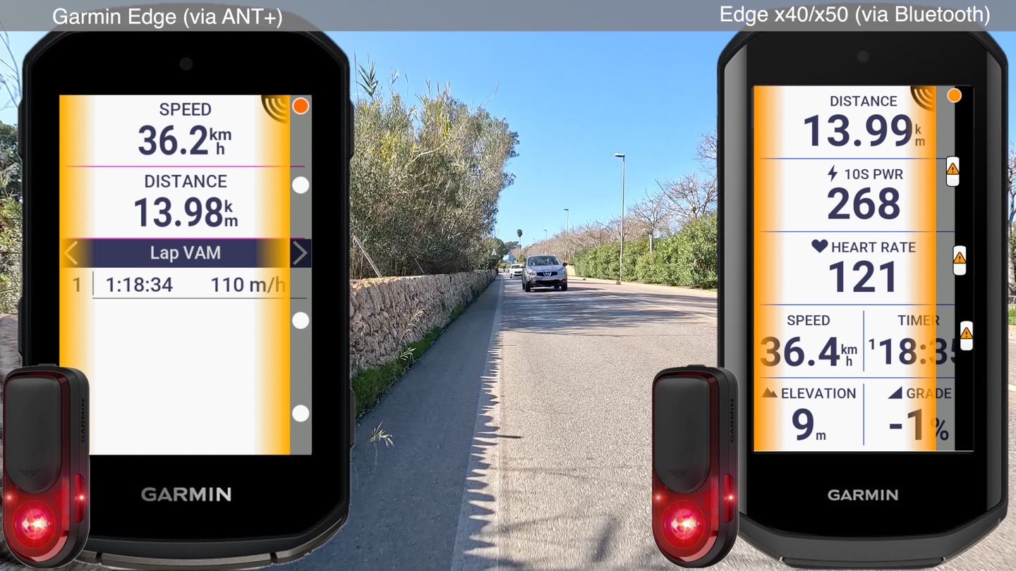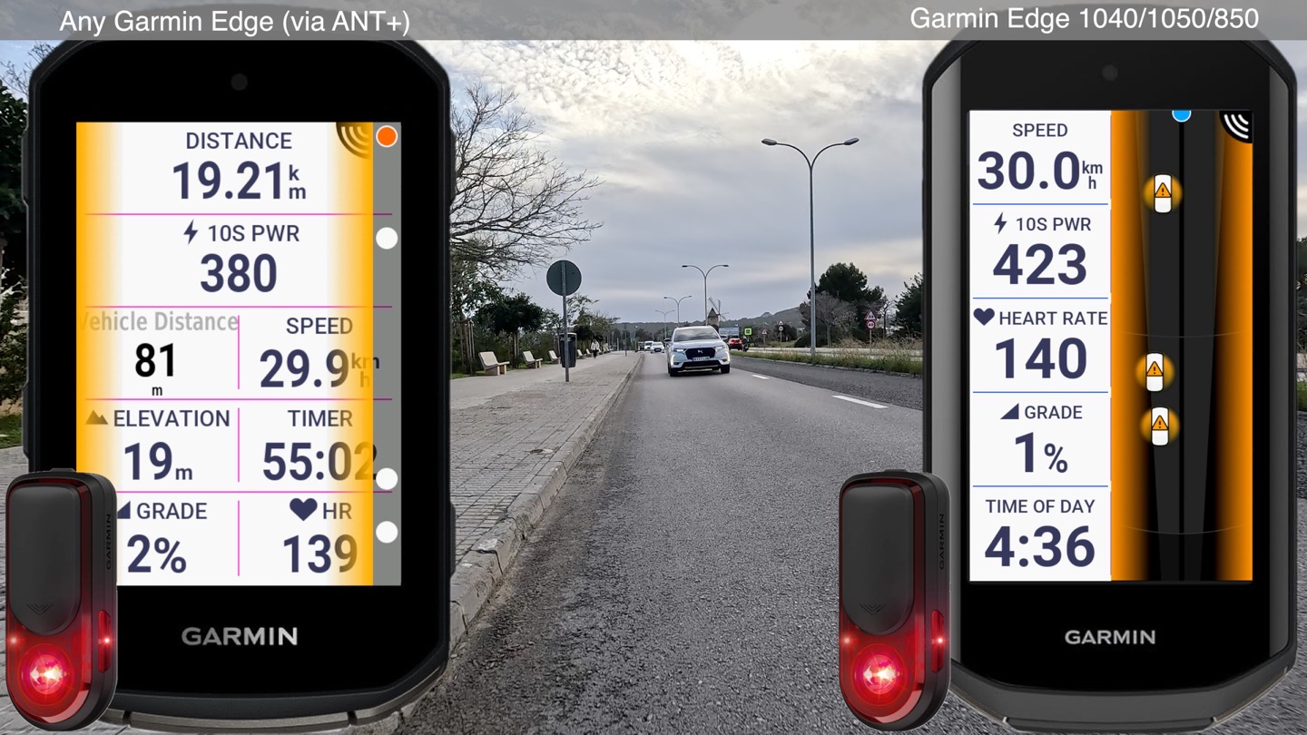 All is good there, and it works just like before. The thing you *won’t* get is the lateral vehicle placement, or the vehicle sizing. Also, you won’t get the color-topped cars (but you will still get red-threat level notifications like before). As an example of this within even the Garmin ecosystem, here’s the exact same moment connected to two bike computers. On the right is the Edge 1050 with the newer firmware, whereas on the left is an Garmin Edge using the regular ANT+ mode. You’ll notice how they display exactly the same number of vehicles, positions, and threat level (color coding). However there’s no lane placement on the older units, small/medium/large vehicle sizing, or orange-topped vehicles: