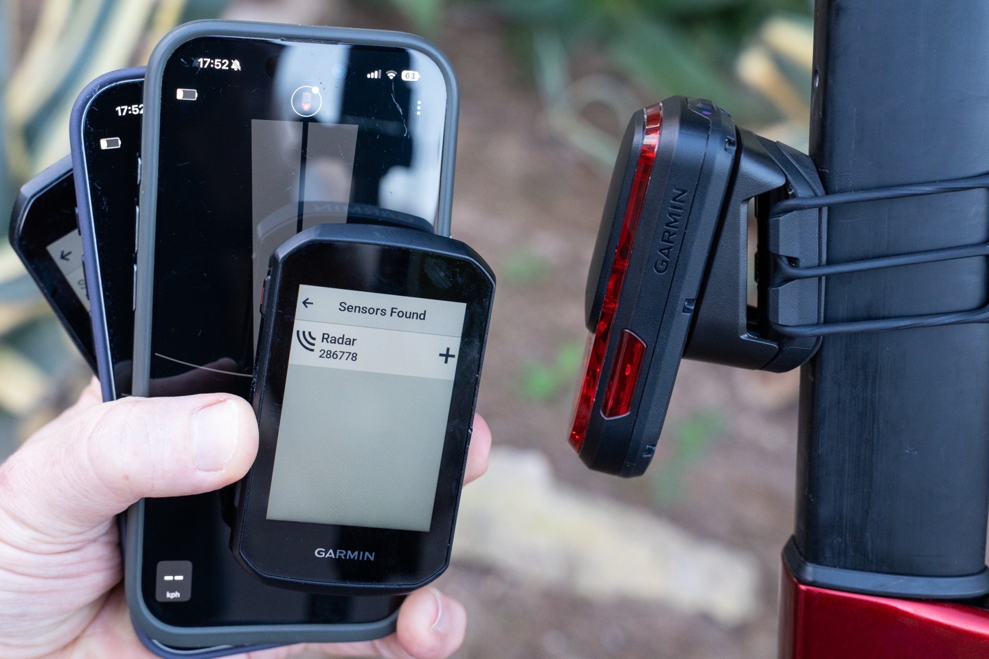 With that set, you’ll get it paired to your bike computer. On a Garmin Edge x40 or x50 series unit, it’ll offer to pair it via secure Bluetooth. Note that if you haven’t updated your firmware on your Garmin Edge unit since before February 2026, you’ll want to do that (otherwise the new features won’t show up). You’ll search for a radar sensor in the settings, and it’ll quickly pair up: