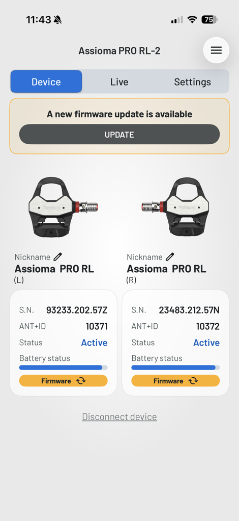 With that set, you’ll attach the charging cable to each pedal.This is required to wake-up the pedal from the factory sleep state. After that, crack open the Favero app, here you’ll search for nearby pedals to pair to: