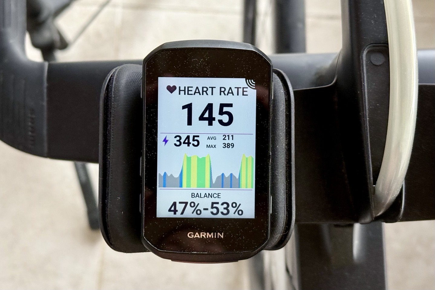 With all that sorted, once you start pedaling, you’ll get your cycling data on any data pages you’ve configured. For example below showing my power in the center chart, and then left/right power balance lower down.