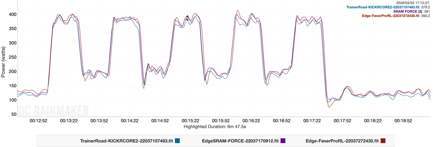 In any case, the SRAM & Favero units remained close throughout, though you’ll see slight variation second to second.